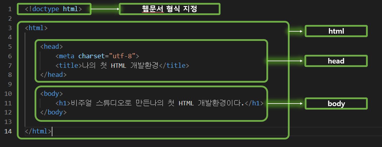 <!doctype html> 부분의 경우는 현재 문서가 html으로 쓰였다는 것을 알려주고 있으며,