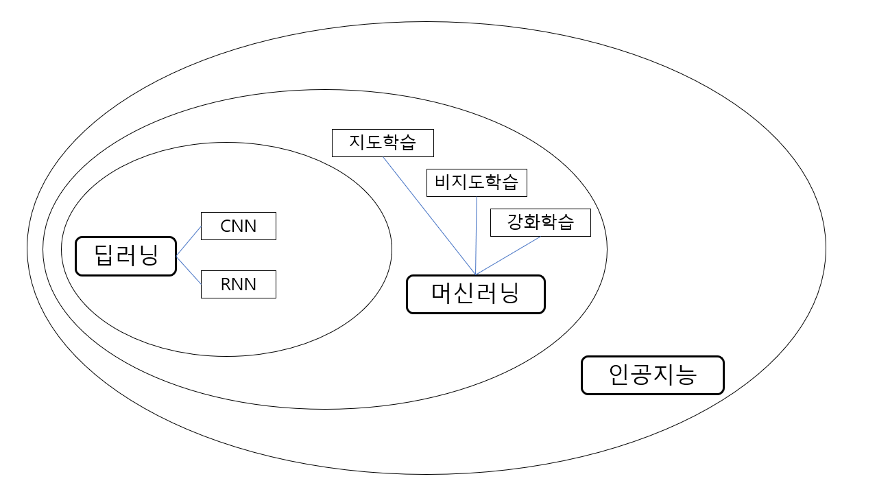 즉, 인공지능>머신러닝>딥러닝 의 포함관계에 있음을 파악할 수 있습니다.