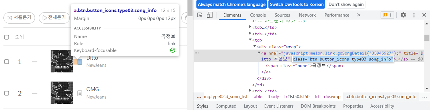 멜론 차트에 접속을 했으니 이제 곡정보로 들어가야하는데, 곡정보의 경우 아래와 같은 곡정보 버튼을 클릭해야하므로