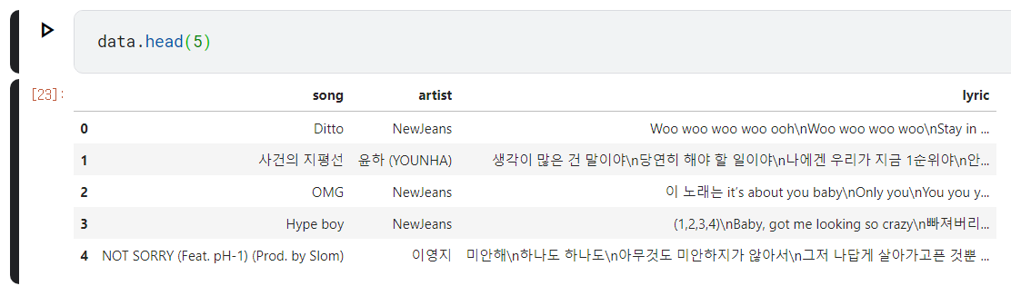 해당 데이터프레임을 활용한 AI 노래가사 만들기를 한번 해보려고 한다.