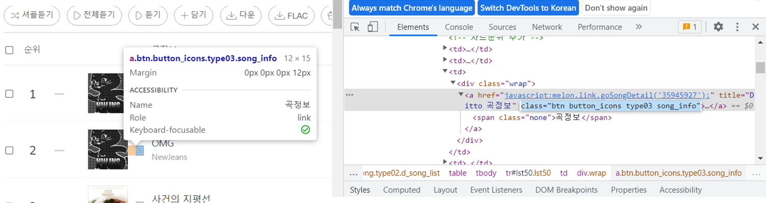 즉 우리는 CSS 실렉터로. btn.button_icons.type03.song_info로 곡정보 더 보기 버튼요소들을 저장해 놓을 수 있다.