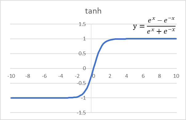 쌍곡선함수의 일종이다. 시그모이드 함수와 비슷한 모양이나 시그모이드 함수와 달리 출력을 0을 중심으로 (-1,1)의 출력을 가지는 함수이다.