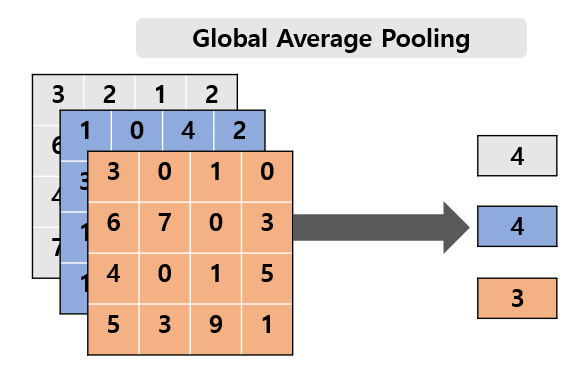 GlobalAveragePooling, 일명 GAP는 두 풀링과는 달리 한 FeatureMap에서가 아니라 각 Feature Map에서 평균을 가져온다.