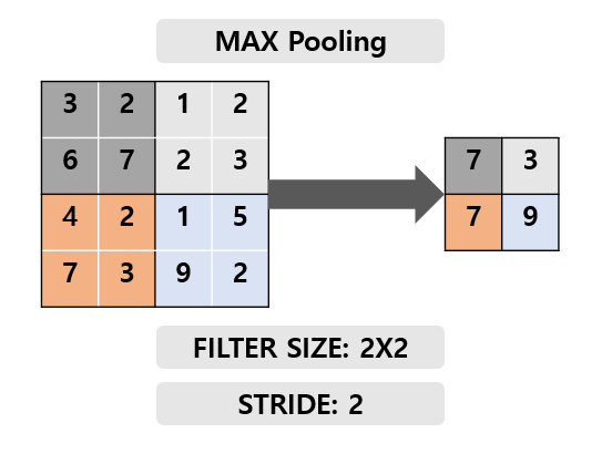 MaxPooling은 필터(커널) 내의 값 중 가장 큰 값을 가져온다.