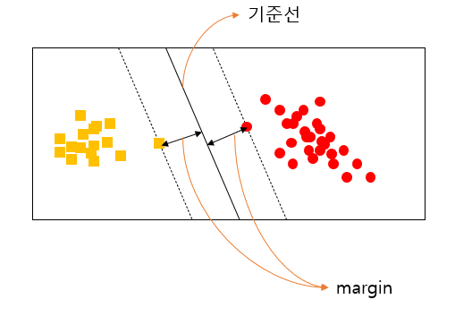 선형 SVM분류기의 경우, 기준선과 각 클래스 간의 거리(margin)가 가장 크도록 선을 긋는다.
