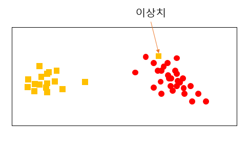 하드 마진 분류는 아래[그림-2]와 같이 이상치가 생기면 아래처럼 기준선을 긋지 못하는 현상이 발생할 수 있다.