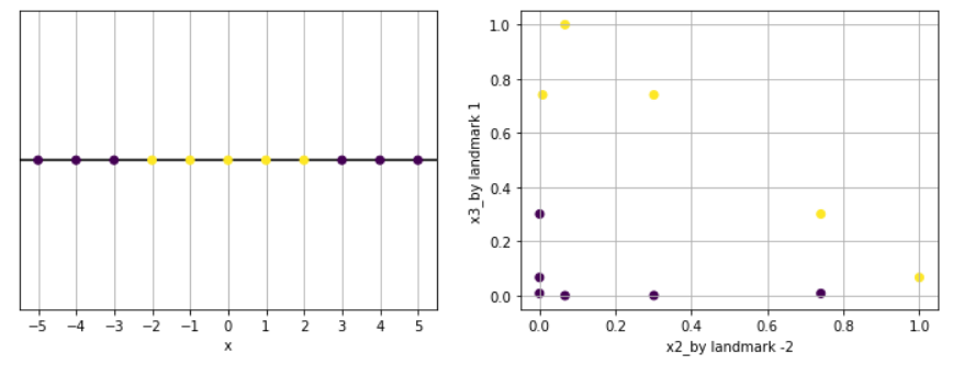 가우시안 RBF를 적용해 첫 번째 랜드마크 -2를 통해 얻은 값들을 특성 x2로, 두번째 랜드마크 1을 통해 얻은 값들을 특성 x3으로 하여 시각화하면 아래 [그림 3-2]와 같다.