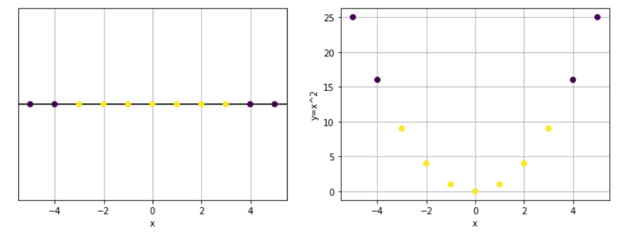 아래 [그림-2]와 같이 하나의 축(x)을 가진 데이터에 축(y=x^2)을 하나 추가함으로써 선형적으로 분류가 가능해진다.