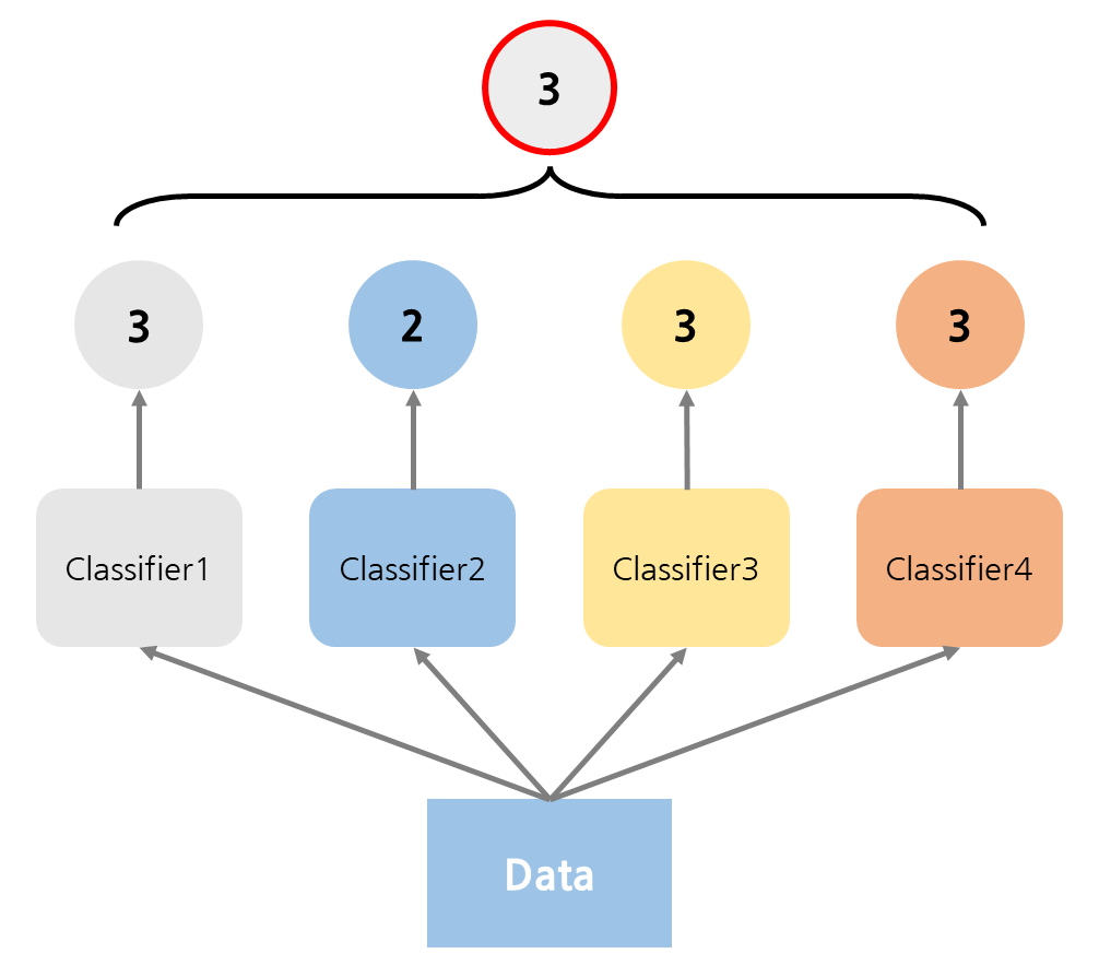 각각의 분류기들이 3,2,3,3의 예측을 내놓으며 가장 많은 예측인 3을 결과로 삼는 것을 볼 수가 있다.