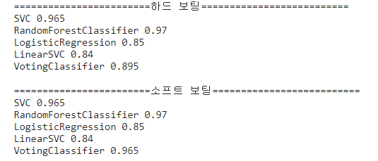 위 코드 실행결과, 아래[그림 3]과 같이 소프트 보팅 방식이 정확도가 더 높게 나오는 것을 확인이 가능하다.