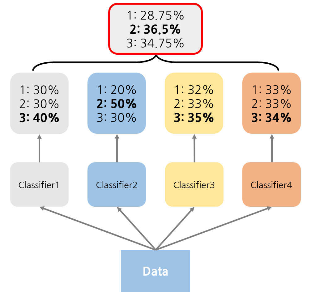 각 분류기들의 예측은 3,2,3,3으로 3이 제일 많지만 각 클래스별 확률 평균 내어 살펴보면 2가 가장 높은 확률을 가지며 이를 결과로 삼는 모습을 볼 수가 있다.