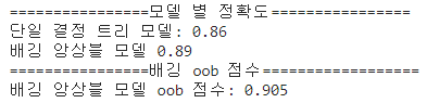print("단일 결정 트리 모델:",accuracy_score(y_test,y_pred1),"\n배깅 앙상블 모델",accuracy_score(y_test,y_pred2))