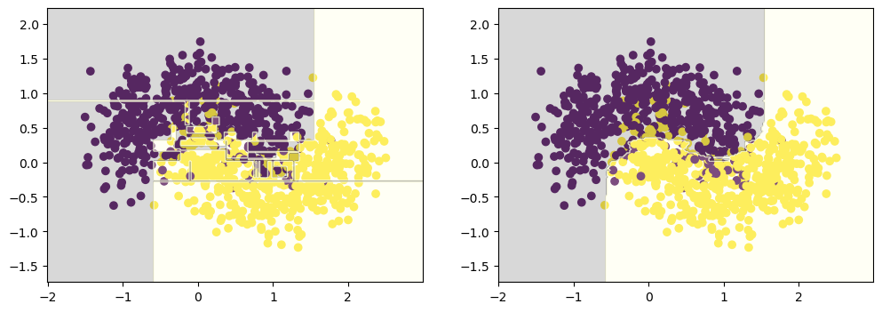 위 [그림 2] 데이터셋을 단일 결정 트리 모델과 500개의 분류기를 사용한 배깅 모델에 학습시켰다.