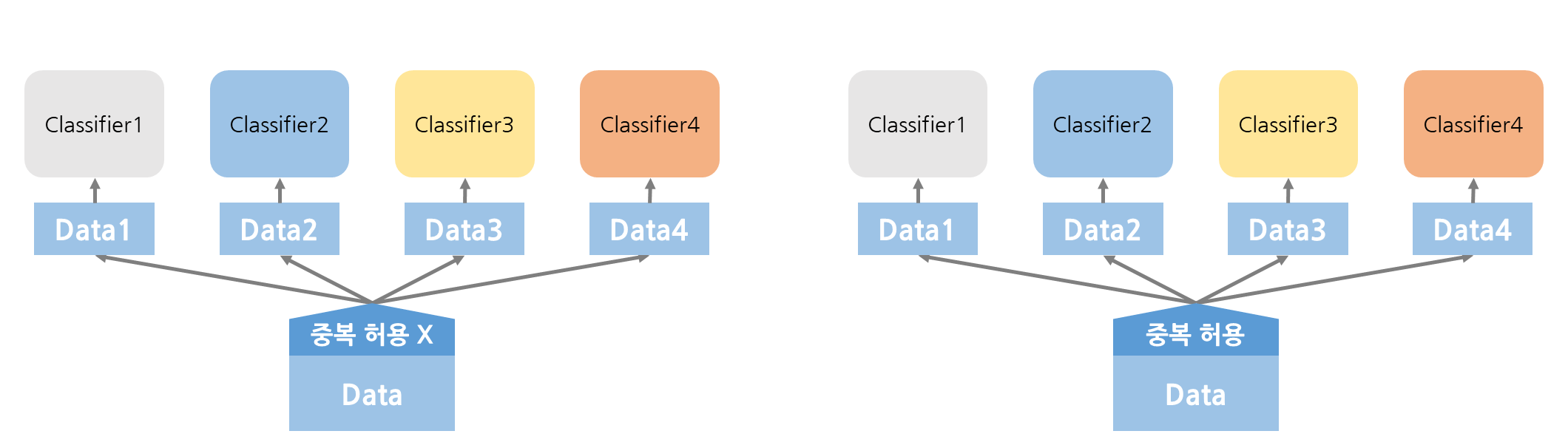 이처럼 배깅은 중복을 허용하며 훈련 데이터셋에서 데이터를 임의로 추출하며